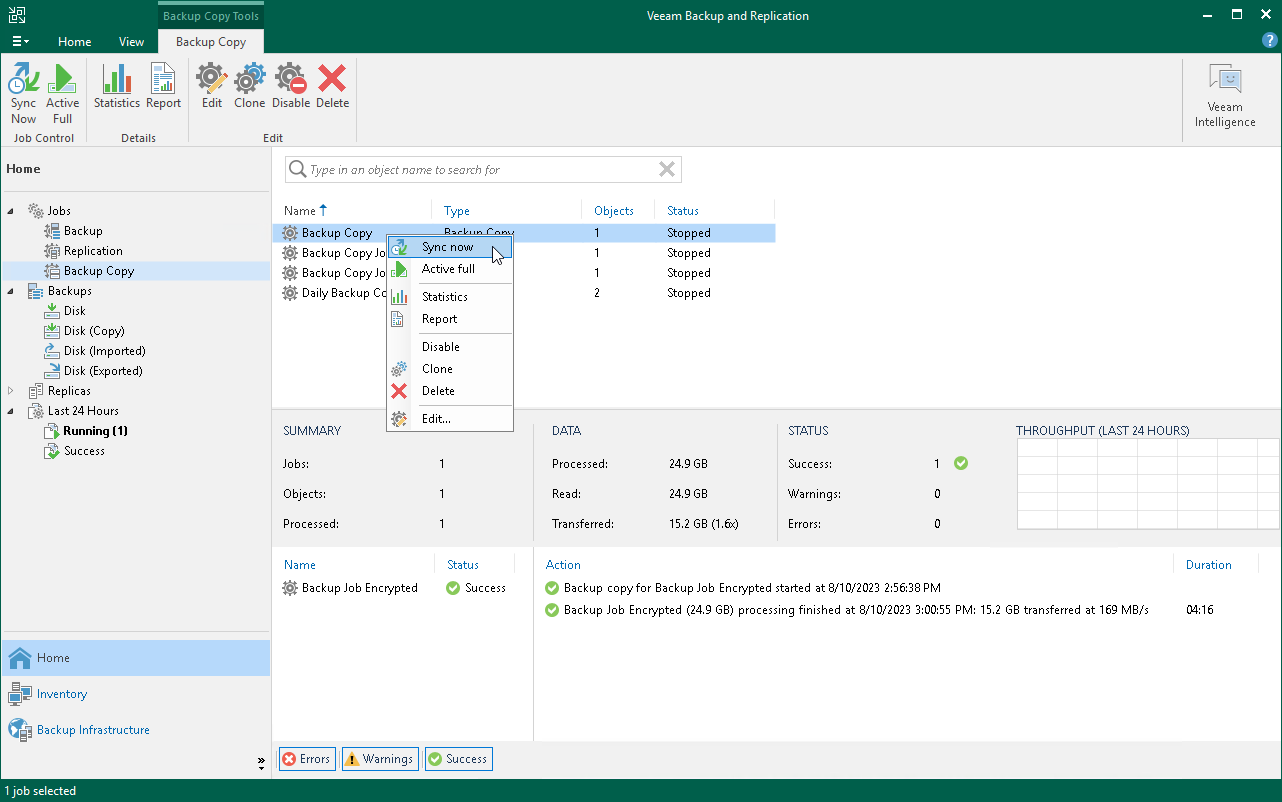 - In the working area, select the backup copy job and click Sync now on the ribbon or right-click the backup copy job and select Sync now.