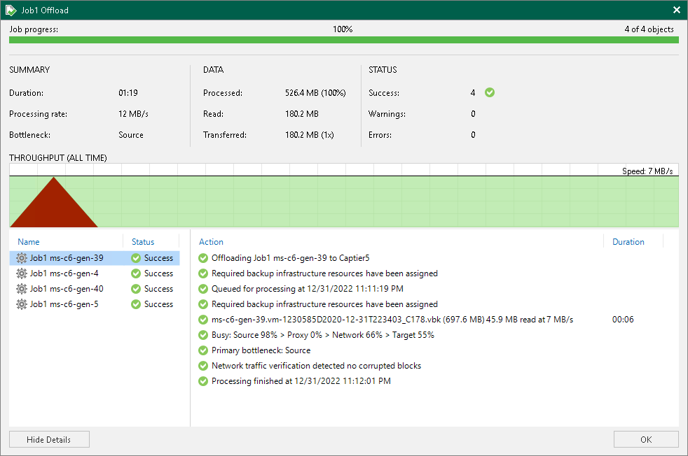 Veeam Backup & Replication displays offload job session statistics for the following counters:
