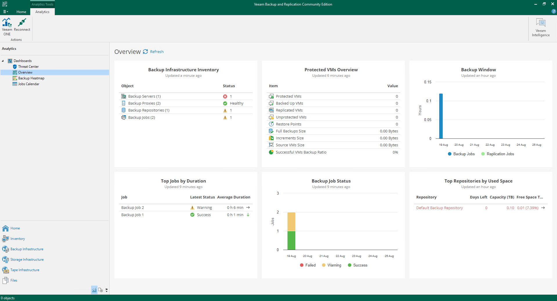 Now, you can use the Analytics view to work view Veeam ONE dashboards for the current backup server.