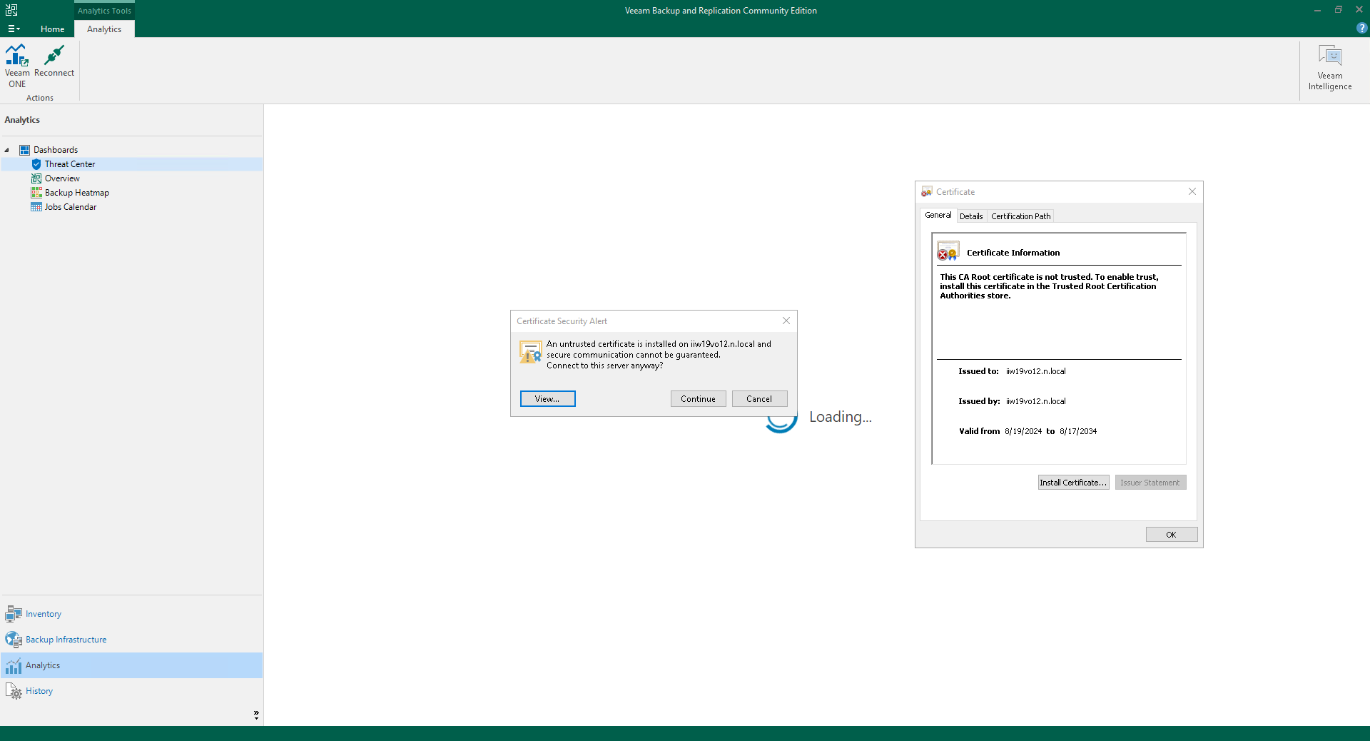 - When opening any dashboard in the Analytics view for the first time, Veeam Backup & Replication will prompt you to install the certificate issued by the server where Veeam ONE is installed.