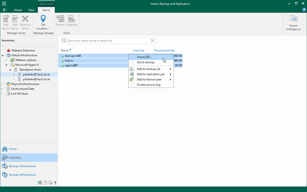 - In the working area, select the VMs and click VeeamZIP > VeeamZIP on the ribbon or right-click the VMs and select VeeamZIP.