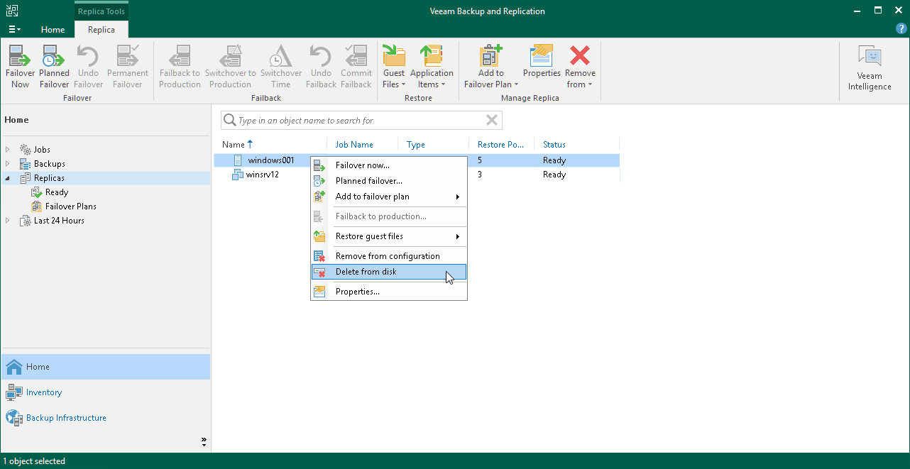 - In the working area, select the necessary replica and click Remove from > Disk on the ribbon. As an alternative, right-click the replica and select Delete from disk.