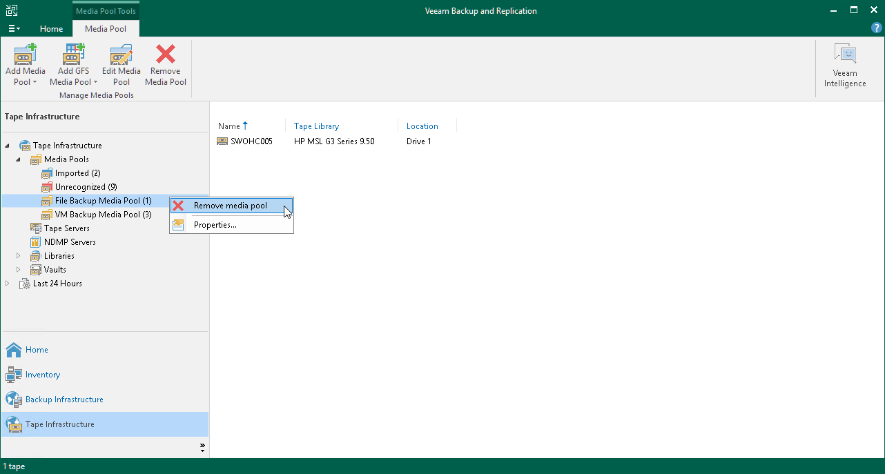 - You cannot remove a media pool that is used in a backup to tape or file to tape job. To remove such media pool, you need to point the jobs to other media pools or GFS media pools.