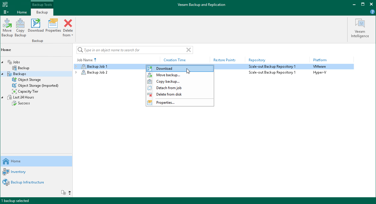 - On the ribbon, click Download or in the working area, right-click a backup job and select Download.