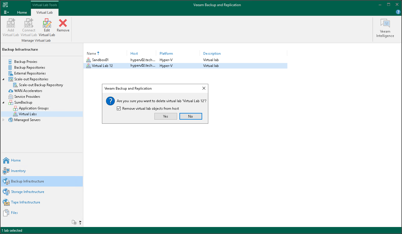 Always use Veeam Backup & Replication to modify or delete a virtual lab. If you change lab settings or delete any of its components from outside, for example, in Hyper-V Manager, the lab will be corrupted and its component such as the created virtual switch will remain in the virtual infrastructure.