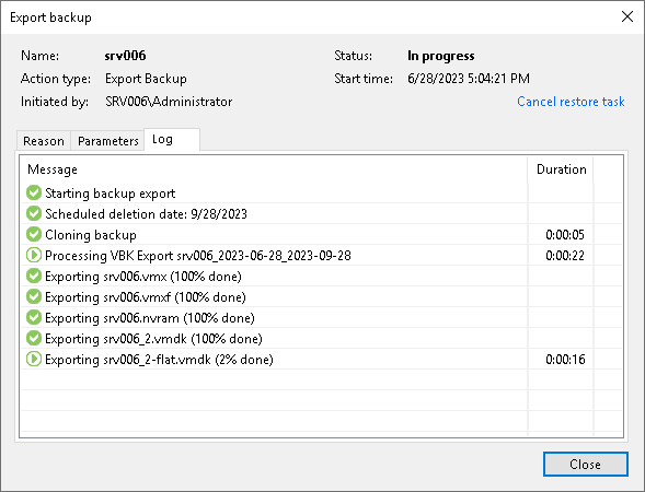 You can close the dialog box by clicking the Close button in the lower-right corner and let Veeam perform export in the background.