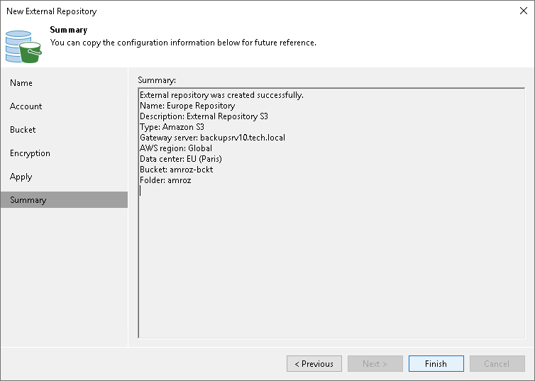 This is an archive version of the document. To get the most up-to-date information, see the current version. Step 7. Finish Working with Wizard At the Summary step of the wizard, review the external repository settings and click Finish.