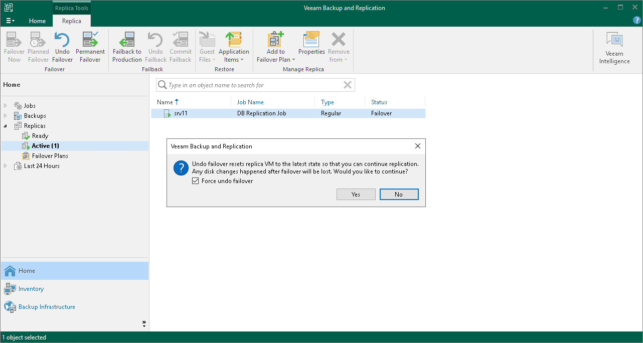 - In the working area, select the necessary replica and click Undo Failover on the ribbon. As an alternative, right-click one of the selected replicas and click Undo failover.