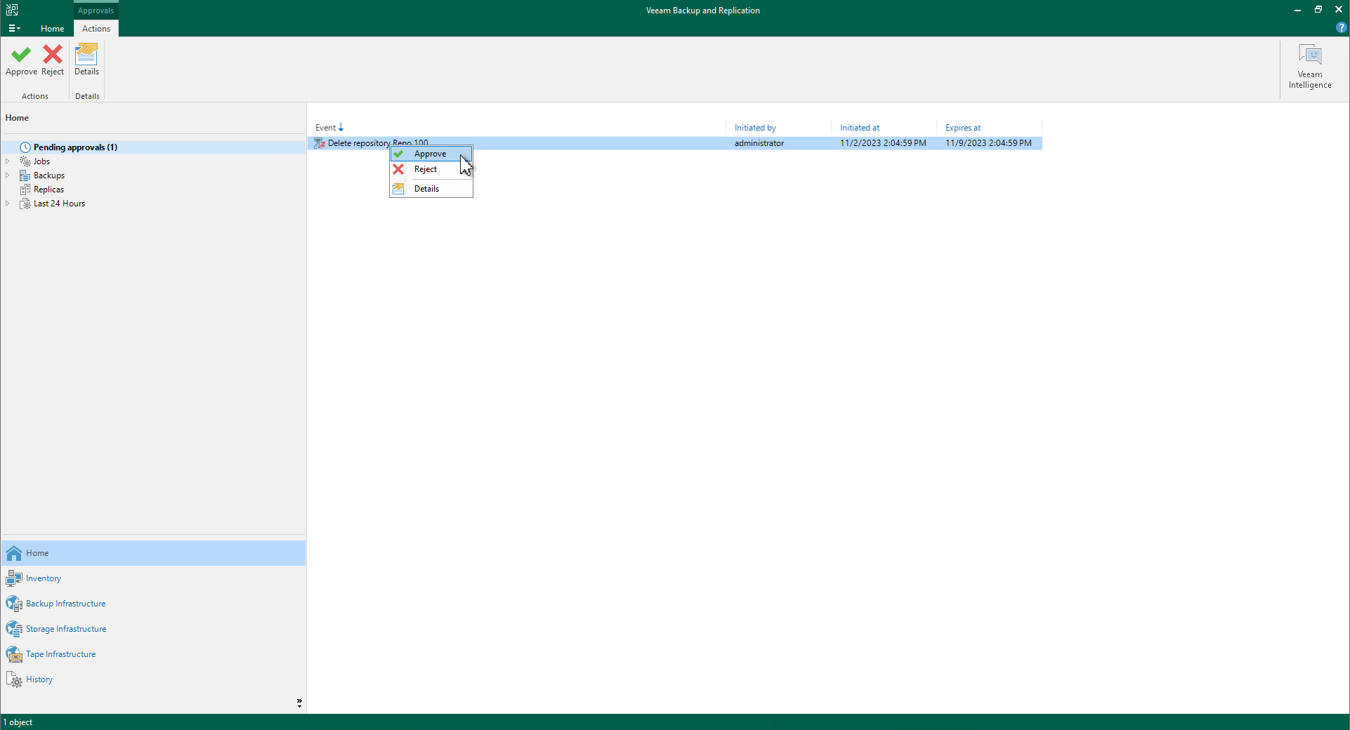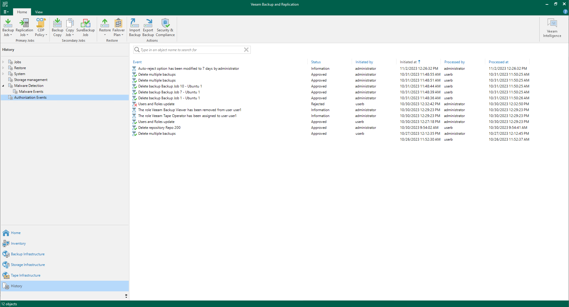 You can enable four-eyes authorization to reduce the risk of accidental actions affecting sensitive data. This functionality requires additional approval for certain operations in Veeam Backup & Replication given by another user. To approve the request, the user must have the Veeam Backup Administrator or Veeam Security Administrator role.