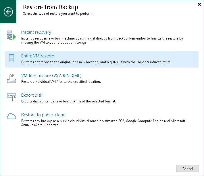 - On the Home tab, click Restore > Microsoft Hyper-V > Restore from backup > Entire VM restore > Entire VM restore.