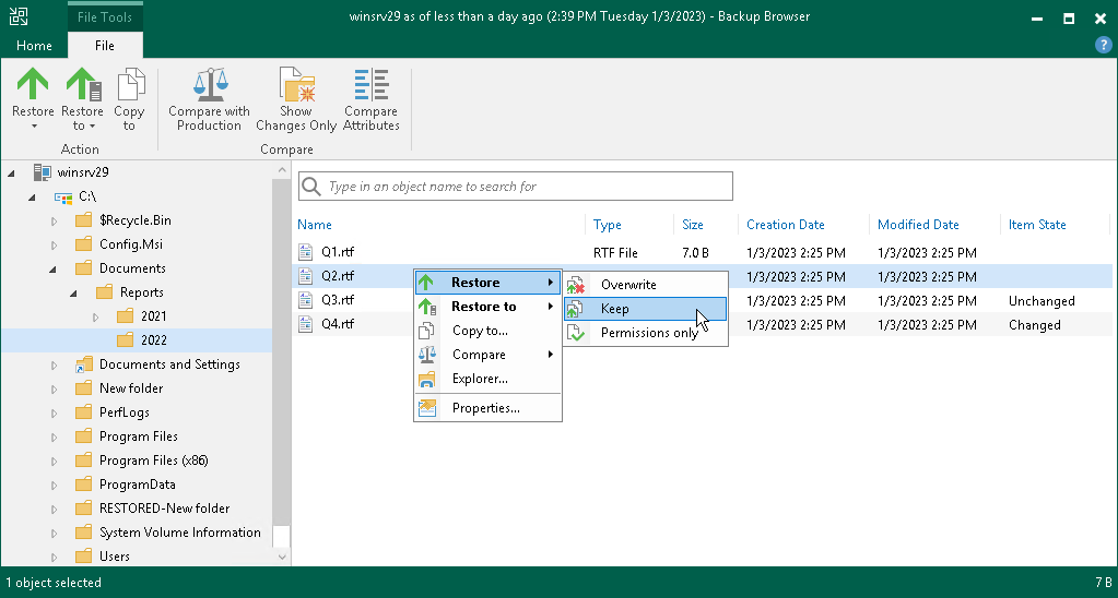 For files and folders in the comparison states, Veeam Backup & Replication provides other restore operations than for files and folders in the non-comparison state. For example, you can restore only changed files and folders. For more information, see Restoring Changed Files and Folders.