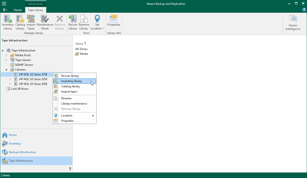 - Click Inventory Library on the ribbon. Alternatively, you can right-click the tape library and select Inventory library from the drop-down menu. Veeam Backup & Replication will perform inventory for all online tapes in the library.