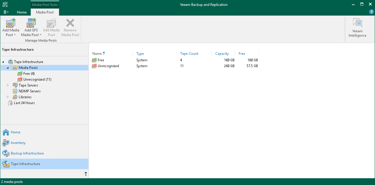 - Tapes that contain data written on another Veeam backup server remain in the Unrecognized pool. Veeam Backup & Replication displays the detected media set name and sequence number for these tapes. If you want to restore data from a specific media set, you need to run the tape catalog job for all tapes in this media set.