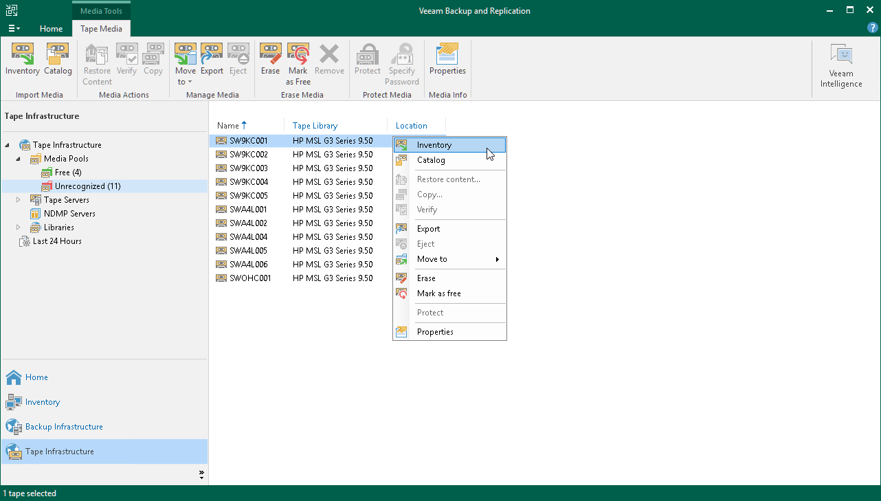 - Select the necessary tapes in the list and click Inventory on the ribbon. Alternatively, you can right-click the selected tapes and choose Inventory.