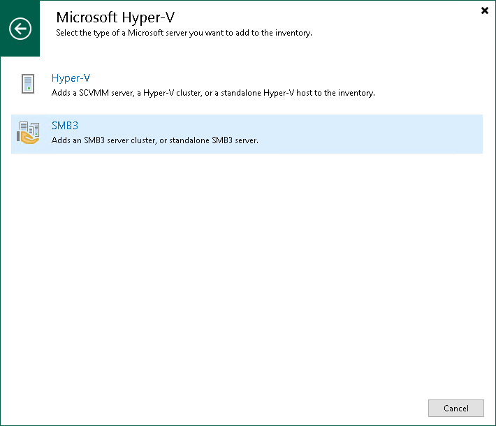- In the Add Server window, click Virtualization Platforms > Microsoft Hyper-V > SMB3.