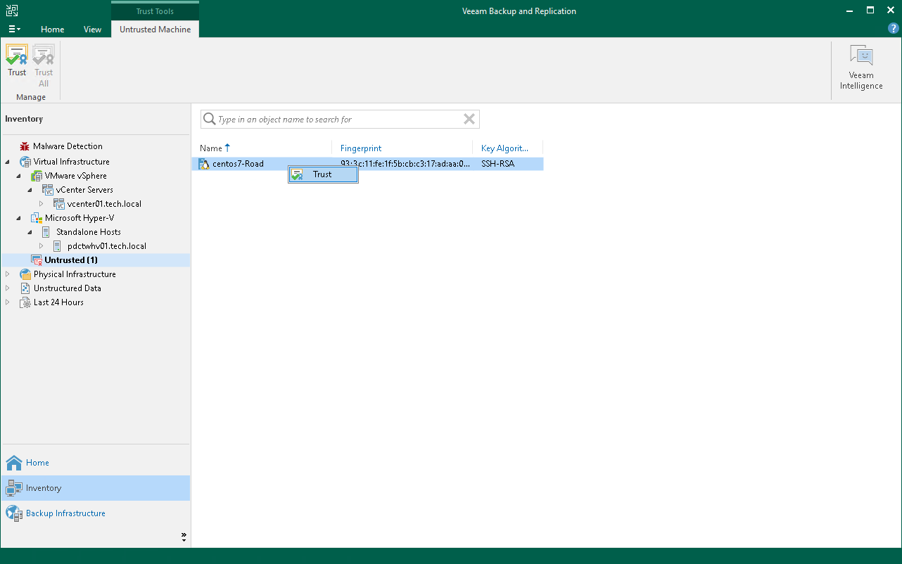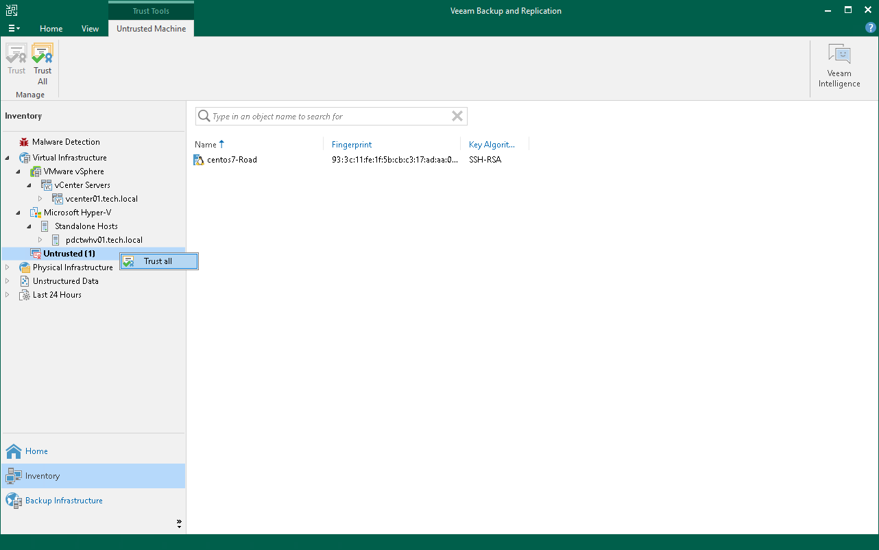 - To validate all untrusted Linux VMs at once, select the Untrusted node and click Trust All on the ribbon. Alternatively, you can right-click the Untrusted node and select Trust all.