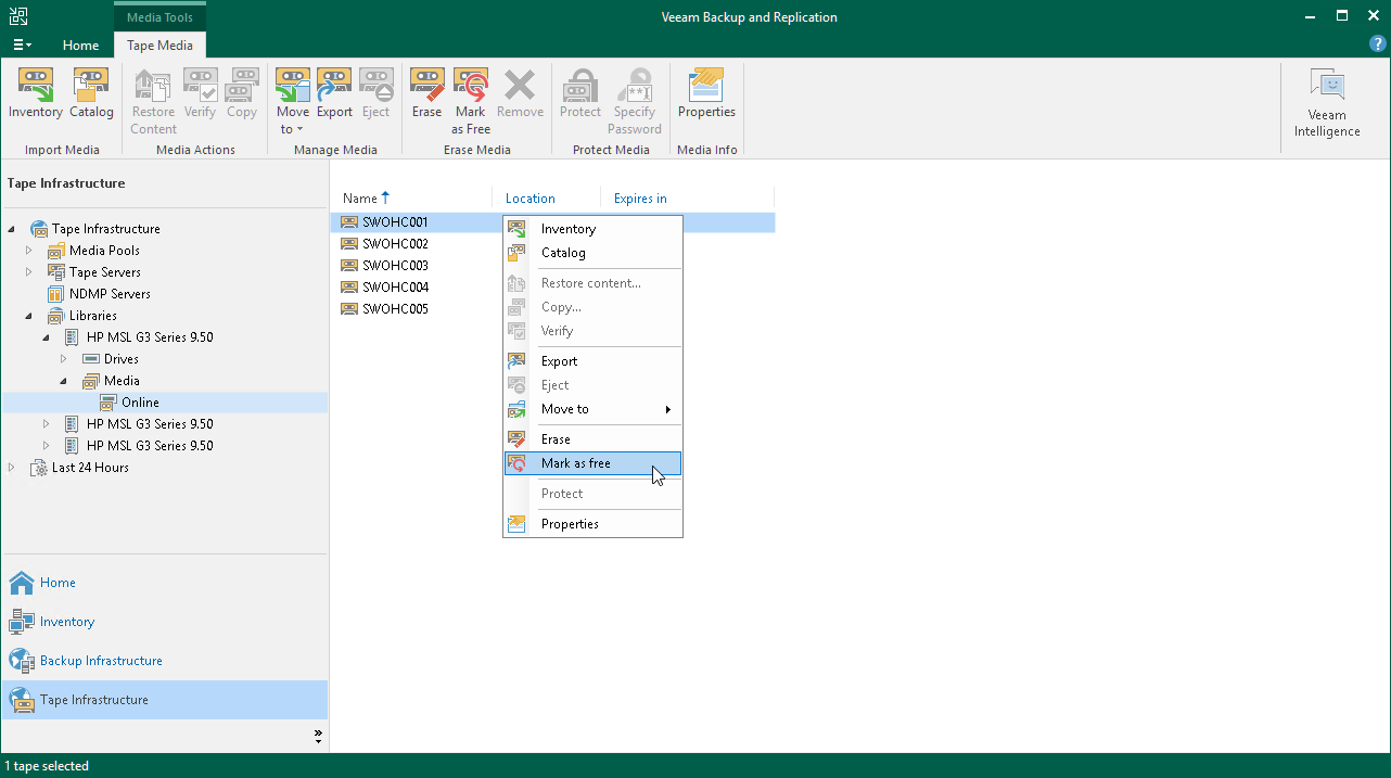 Alternatively, you can right-click selected tapes and select Mark as free from the drop-down menu.