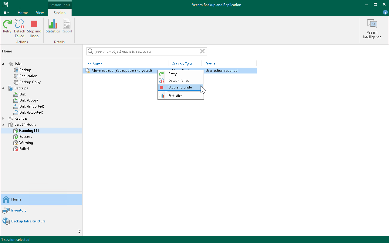 If the move operation fails, Veeam Backup & Replication assigns the User action required status to it. In this case, you need to decide how to finish the operation: retry the move operation for failed workloads, cancel all changes, or move failed workloads but detach their backups. If you detach failed backups, the target job creates active full backups for failed workloads and continues backup chains for other workloads. The detached backups are shown in a node with the (Orphaned) postfix in the inventory pane.