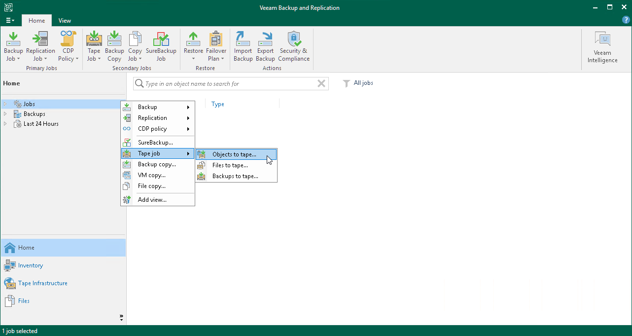 - Open the Home view, right-click the Jobs node and select Tape Job > Objects to Tape.