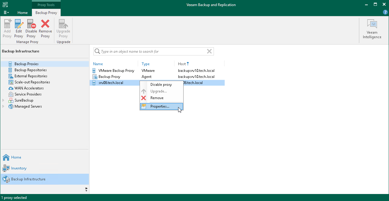 - In the working area, select the off-host backup proxy and click Edit Proxy on the ribbon or right-click the off-host backup proxy and select Properties.