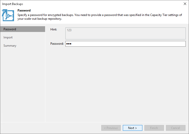 This is an archive version of the document. To get the most up-to-date information, see the current version. Step 2. Specify Password This step is only available when importing encrypted backups.At the Password step of the wizard, in the Password field, specify the password that was used to encrypt data during offload or copy sessions. Related TopicsMoving Backups to Capacity TierCopying Backups to Capacity TierAdd Capacity Tier