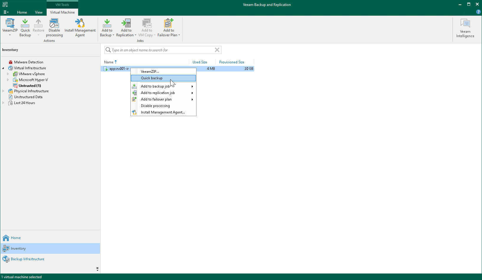 - In the working area, select the VMs and click Quick Backup on the ribbon. You can also right-click the VMs and select Quick Backup.