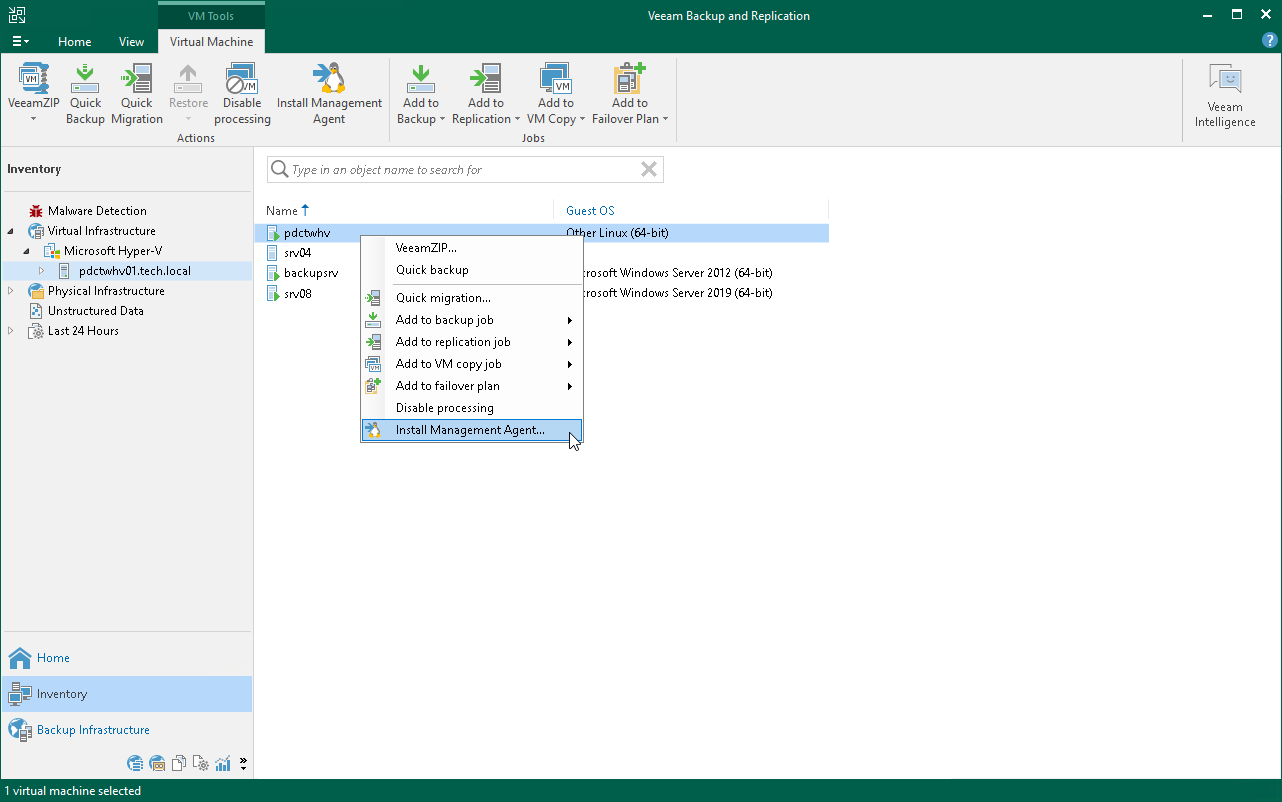 - Open the Inventory view. Select the VM and click Install Management Agent on the ribbon or right-click the VM and select Install Management Agent.
