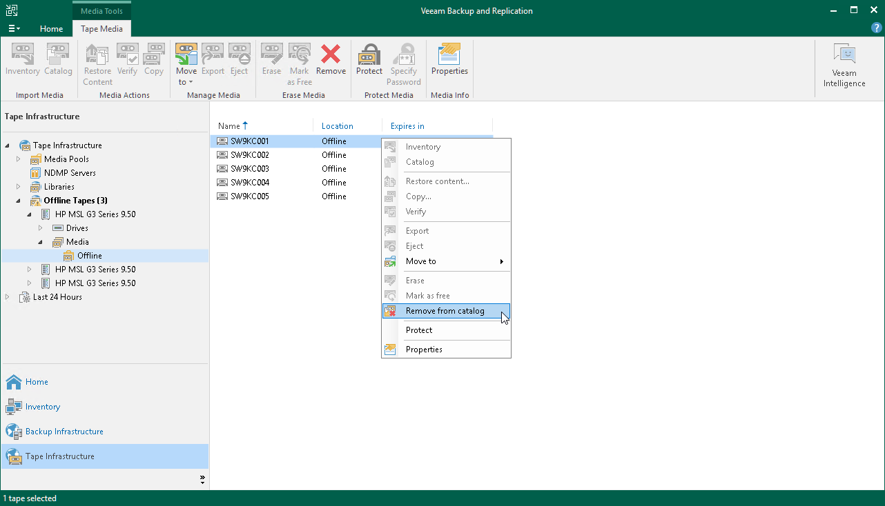 - Select offline tapes you want to remove from the catalog and click Remove on the ribbon. Alternatively, you can right-click selected tapes and select Remove from catalog from the shortcut menu.
