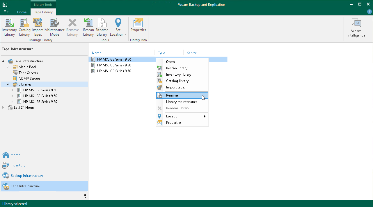 The Veeam backup console shows all tape libraries and standalone tape drives under the list of libraries. By default, the connected devices are shown with their production model names. For clearer visibility, you can rename them.