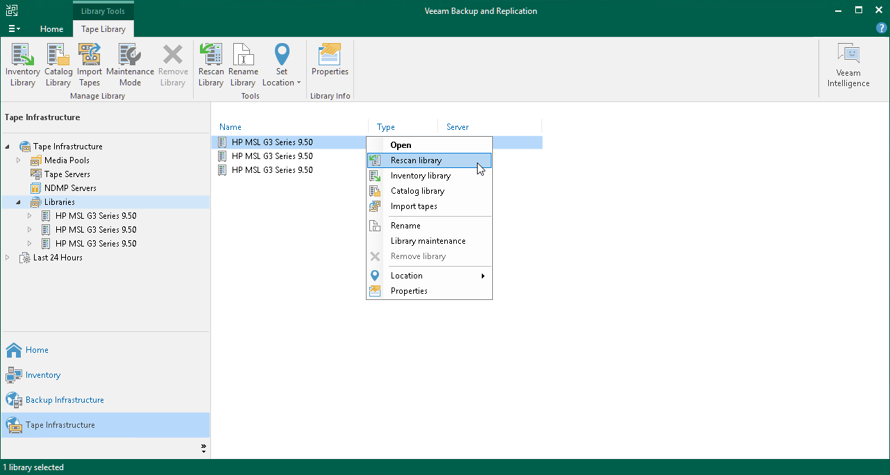- Select a necessary item in the working area and click Rescan Library on the ribbon. You can also right-click the necessary device in the working area and select Rescan library.