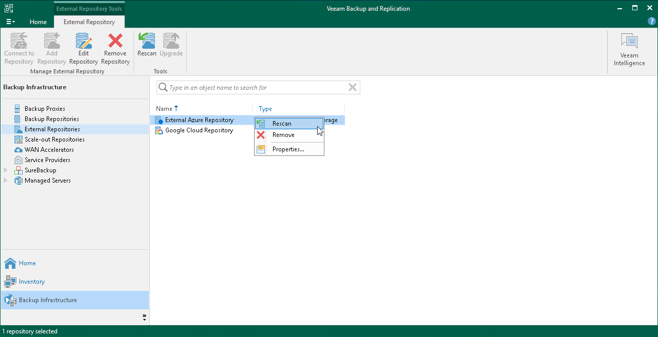 To synchronize the state of an external repository with the state of an object storage (Amazon S3, Azure Blob or Google Cloud Storage), you can use the rescan feature. During rescan, Veeam Backup & Replication fetches newly created restore points and other required metadata.