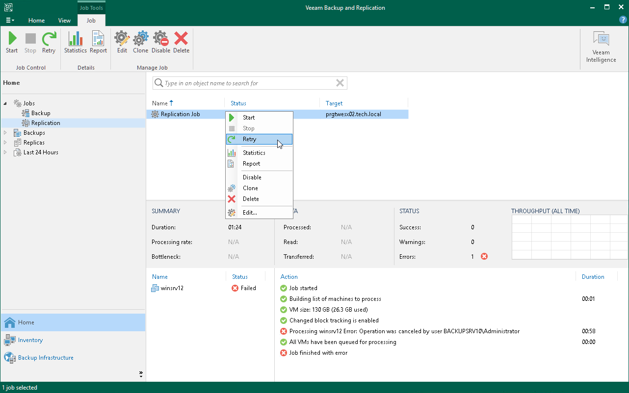 - In the working area, select the necessary replication job and select Retry on the ribbon. Alternatively, you can right-click the necessary replication job and select Retry.