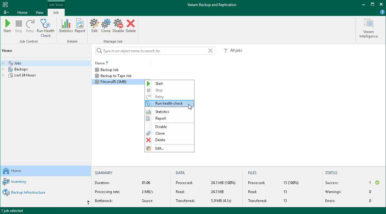 - In the working area, select a job of the File Backup or Object Storage Backup type and click Run Health Check on the ribbon or right-click the job and select Run health check.