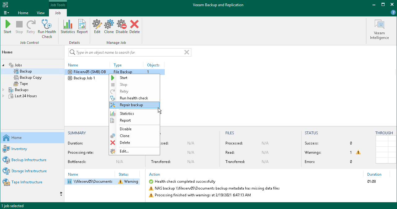 - In the working area, select a job of the File Backup type, right-click the job and select Repair backup.