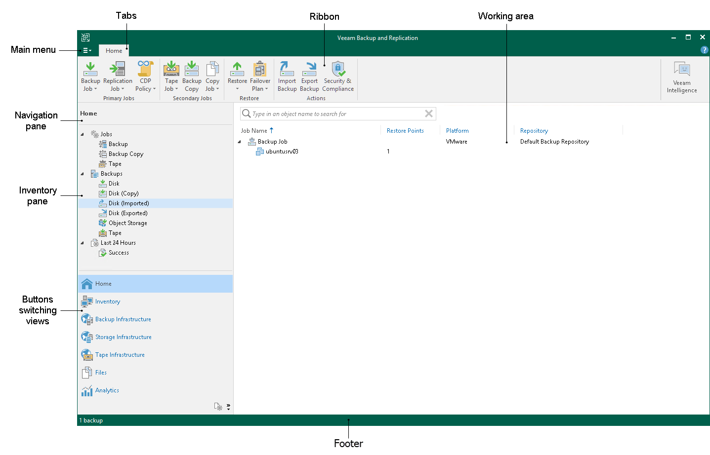 The user interface of Veeam Backup & Replication is designed to let you quickly find commands that you need and perform data protection and disaster recovery tasks.