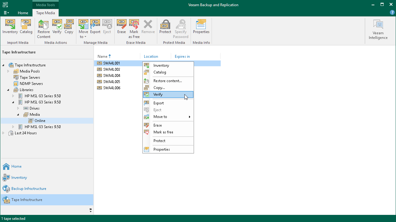 - Select a tape you want to verify and click Verify on the ribbon. Alternatively, you can right-click the selected tape and select Verify from the drop-down menu.