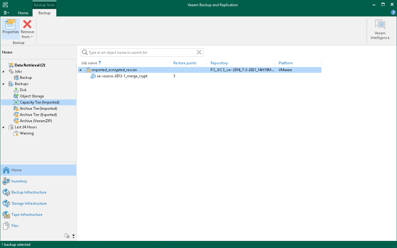 This is an archive version of the document. To get the most up-to-date information, see the current version. Viewing Imported Backups To view imported backups, do the following:Open the Home view.In the navigation pane, select the Backups > Capacity Tier (Imported) or Archive Tier (Imported) node.In the preview pane, review imported backups.