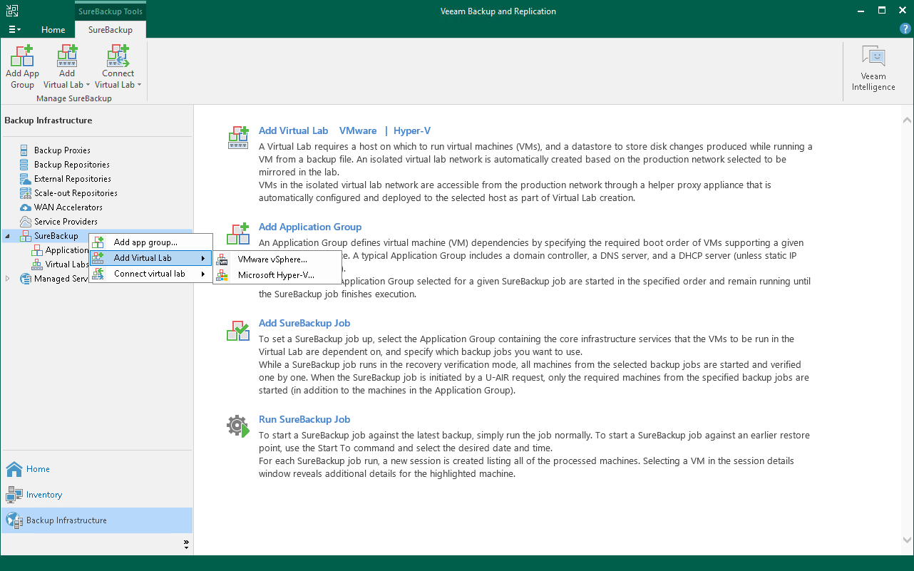- Open the Backup Infrastructure view, in the inventory pane select SureBackup. In the working area, click Add Virtual Lab > Hyper-V.