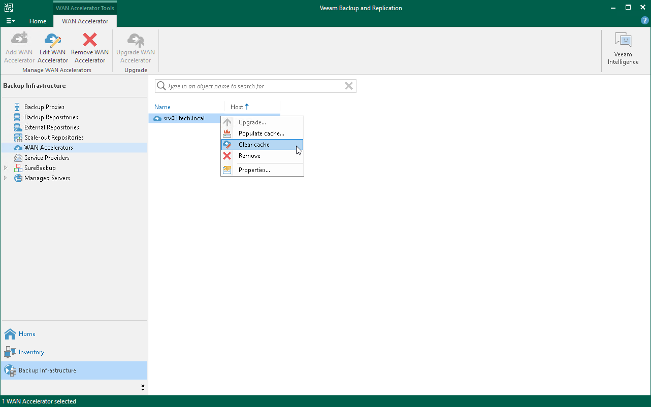 - In the working area, right-click the target WAN accelerator and select Clear cache.