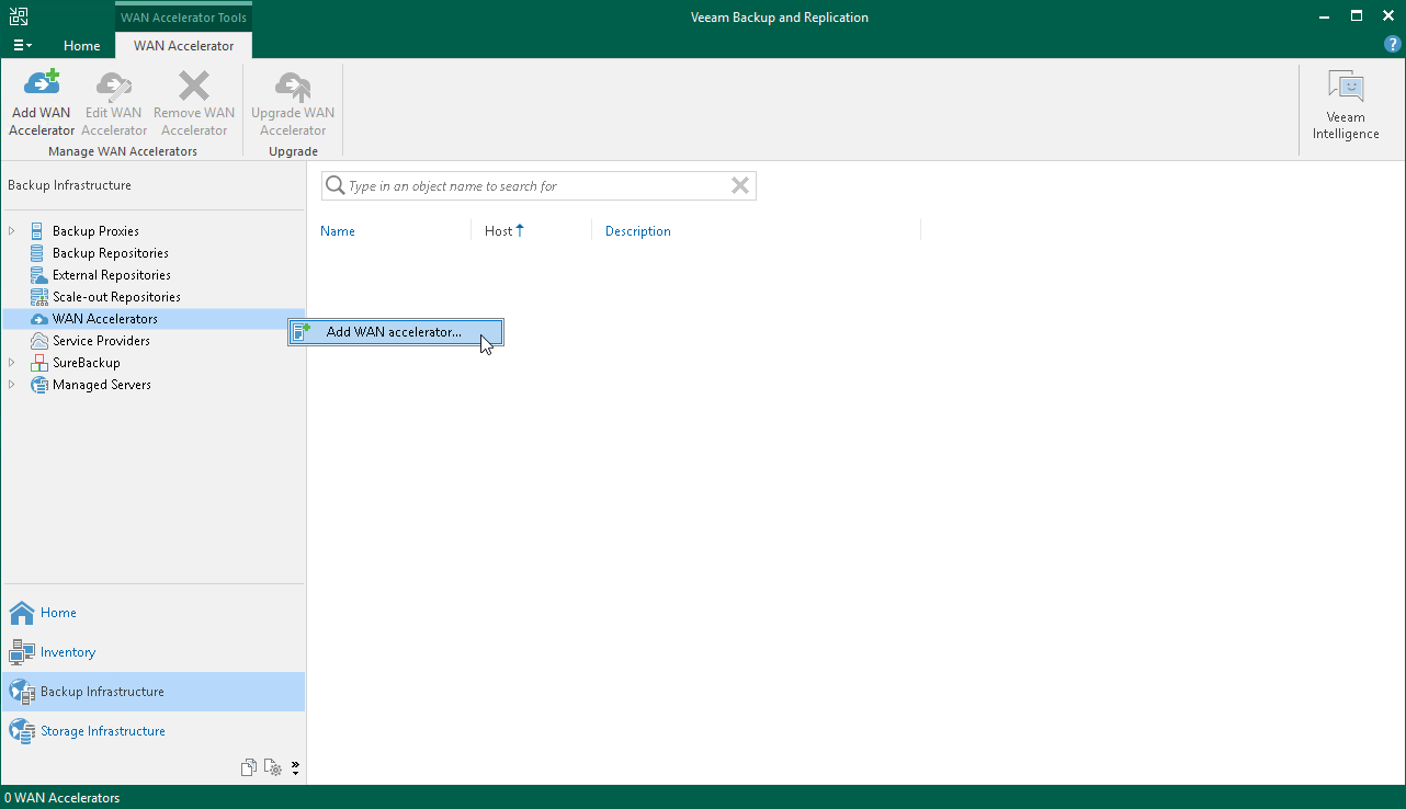 - Open the Backup Infrastructure view, in the inventory pane select WAN Accelerators and click Add WAN Accelerator on the ribbon.
