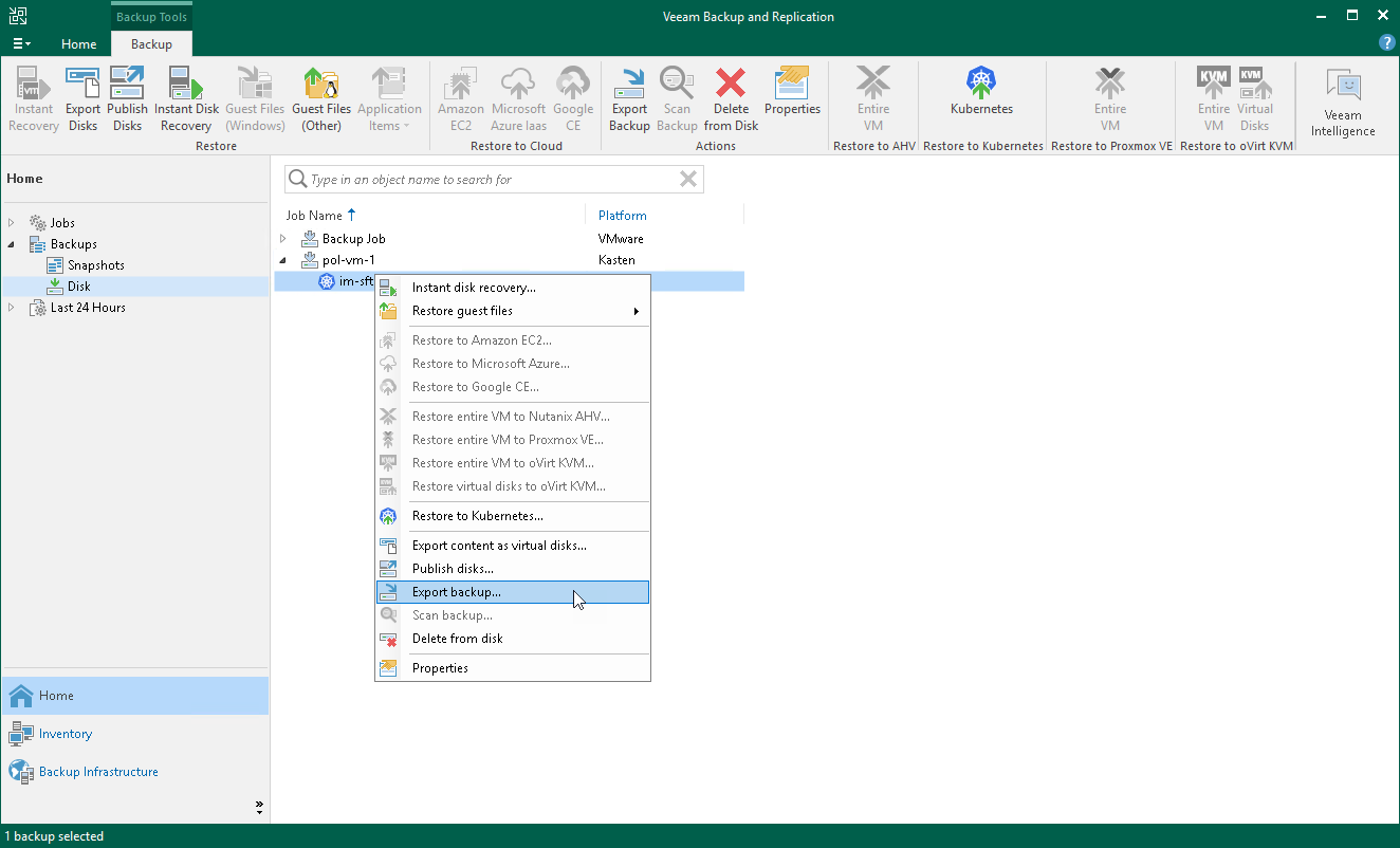 - Launch the Export Backup wizard. To do that, open the Home view. In the inventory pane, navigate to Backups > Disk. In the working area, select applications whose restore points you want to export. On the ribbon, click Export Backup. Alternatively, right-click the application and select Export backup.