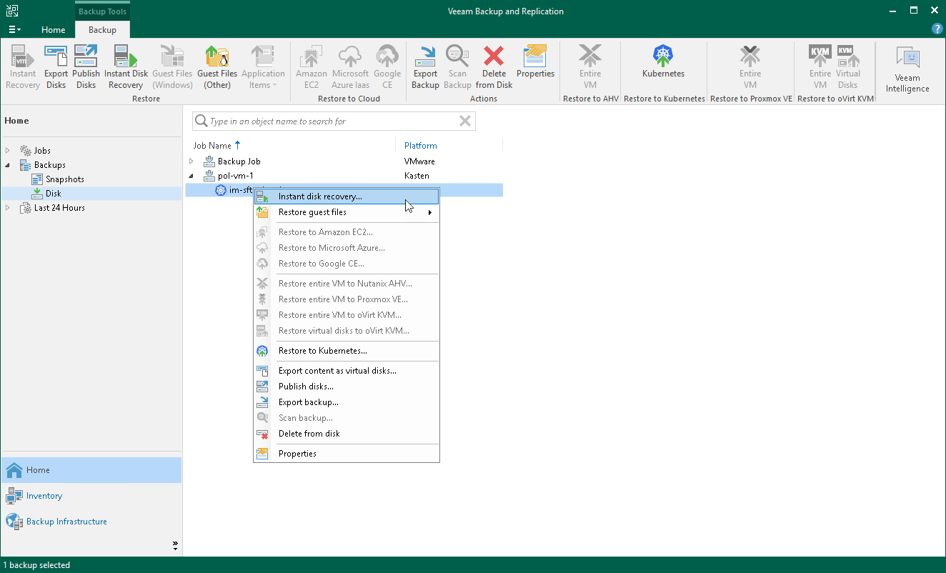 - Launch the Instant Disk Recovery wizard. To do that, open the Home view. In the inventory pane, navigate to Backups > Disk. In the working area, select an application whose disk you want to export. On the ribbon, click Instant Disk Recovery. Alternatively, right-click the application and select Instant disk recovery.