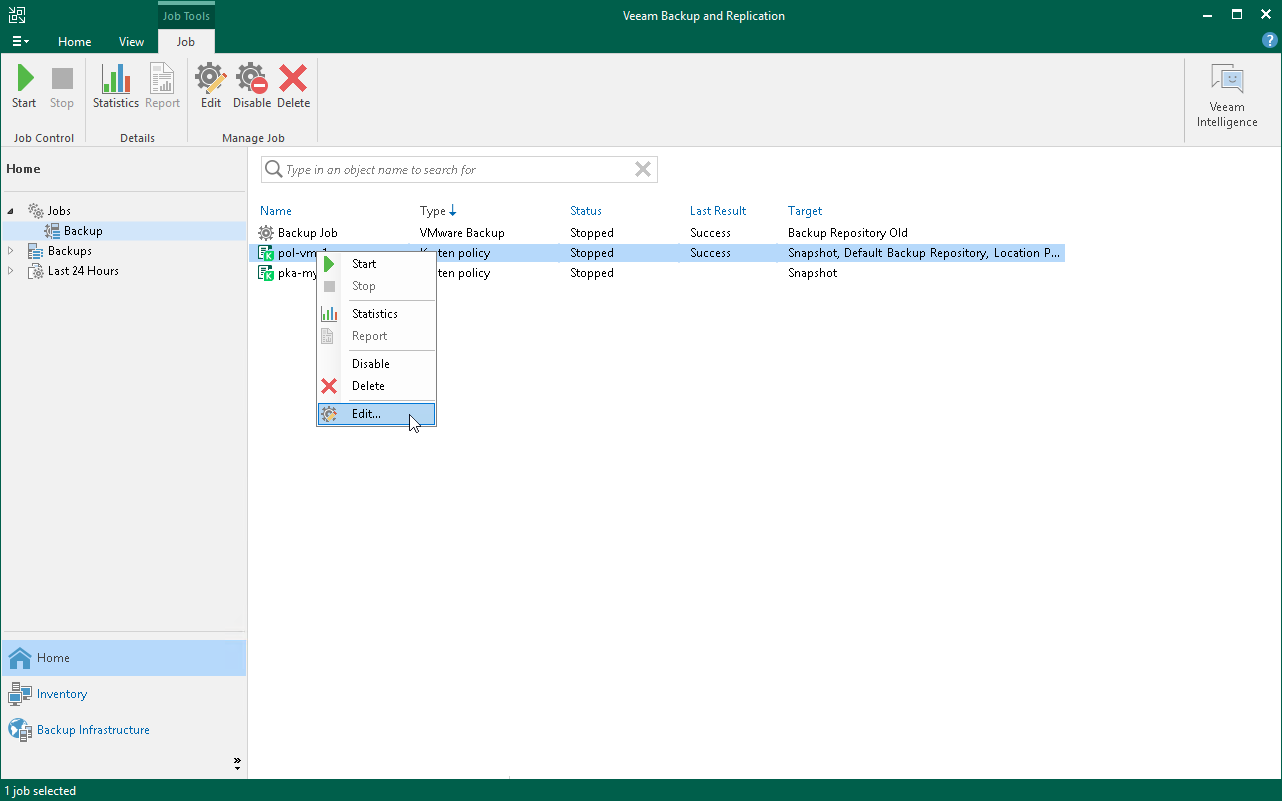 - In the working area, select the necessary backup policy and click Edit on the ribbon. Alternatively, right-click the policy and select Edit. The Edit Policy wizard will open in your browser.