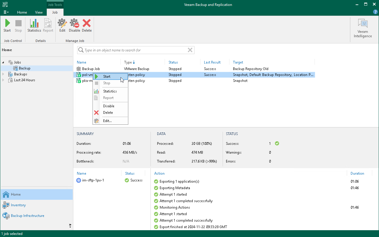 - In the working area, select the necessary Kasten policy and click Start on the ribbon. Alternatively, right-click the selected policy and click Start.