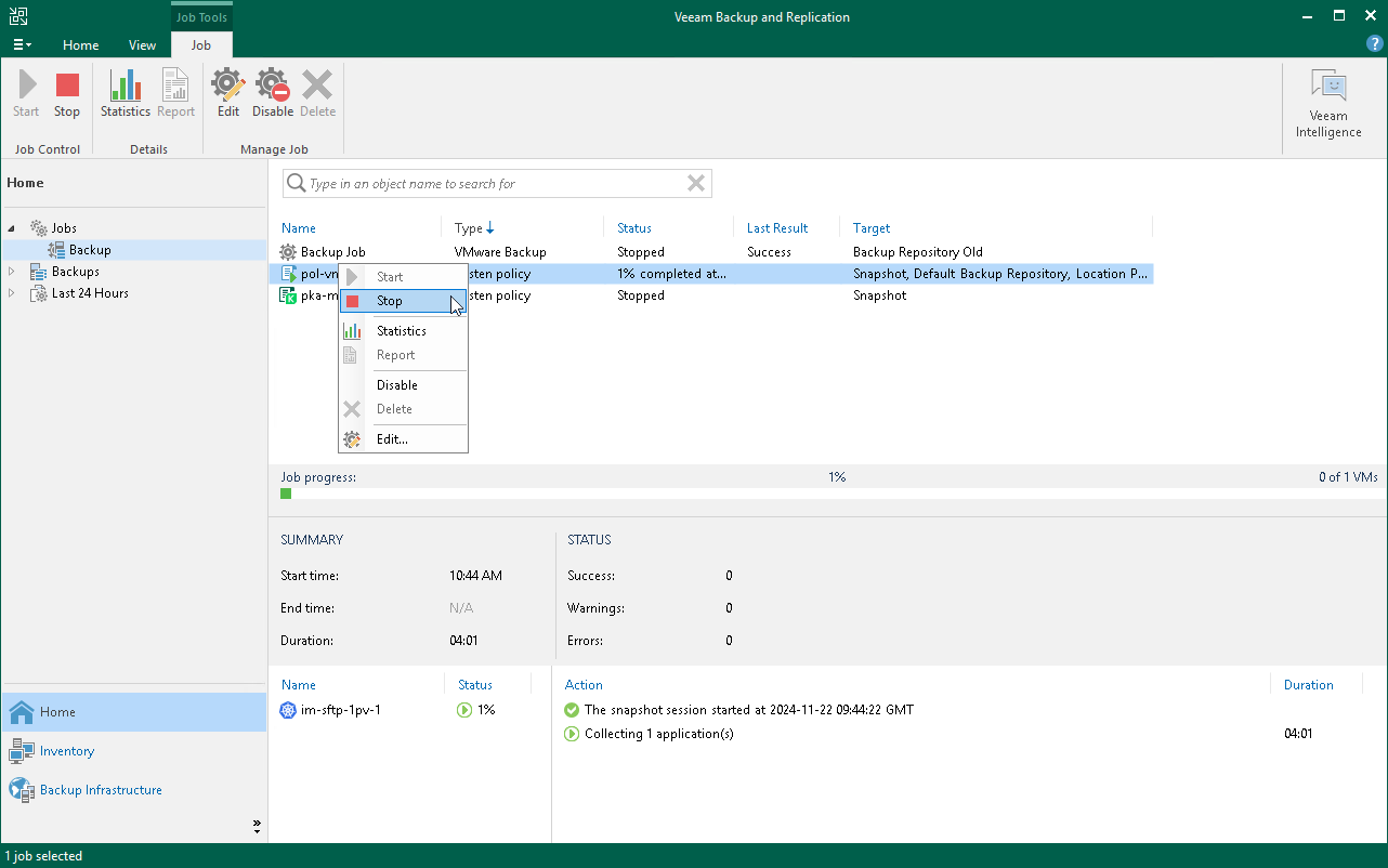 Veeam Kasten for Kubernetes allows you to start a Kasten policy manually from the Veeam Backup & Replication console. It can be helpful if you want to create an additional snapshot or export without modifying the configured backup policy schedule. Additionally, you can stop a Kasten backup policy if the processing of applications is about to take too long and you do not want the policy to produce a heavy load on the production environment during business hours.