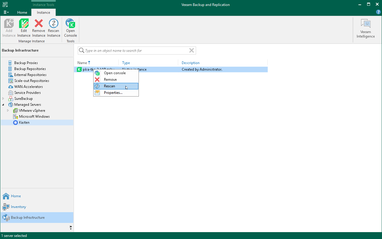 You can rescan the Kasten instance configured in the backup infrastructure. It may be necessary when the Kasten instance becomes unavailable, or there is a mismatch between data in the backup console and on the actual appliance. Veeam Backup & Replication will erase and re-download Kasten instance settings and some statistics during the rescan operation.