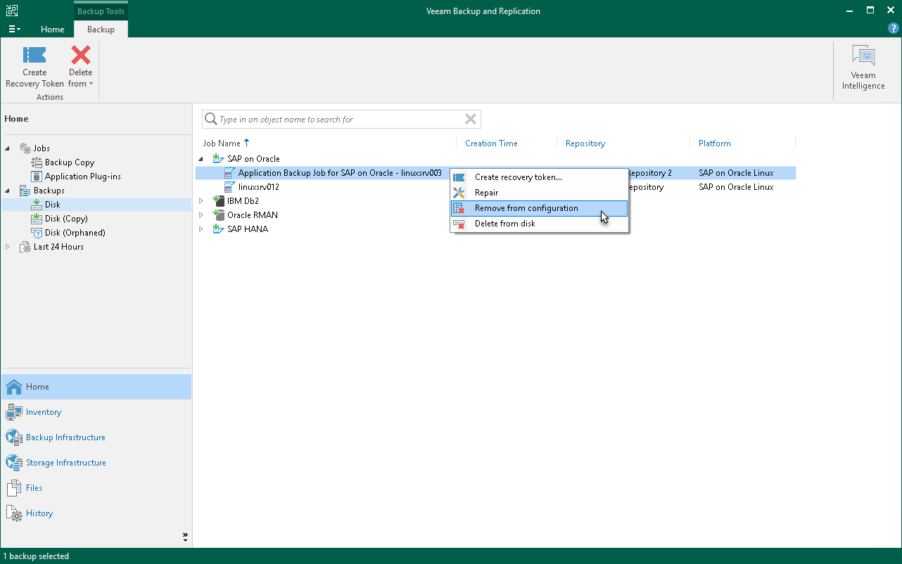 If you want to remove records about application backups from the Veeam Backup & Replication console and configuration database, you can use the Remove from configuration operation. When you remove an application backup from configuration, the actual backup files remain on the backup repository. You can import the backup to the Veeam Backup & Replication at any time later and restore data from it.