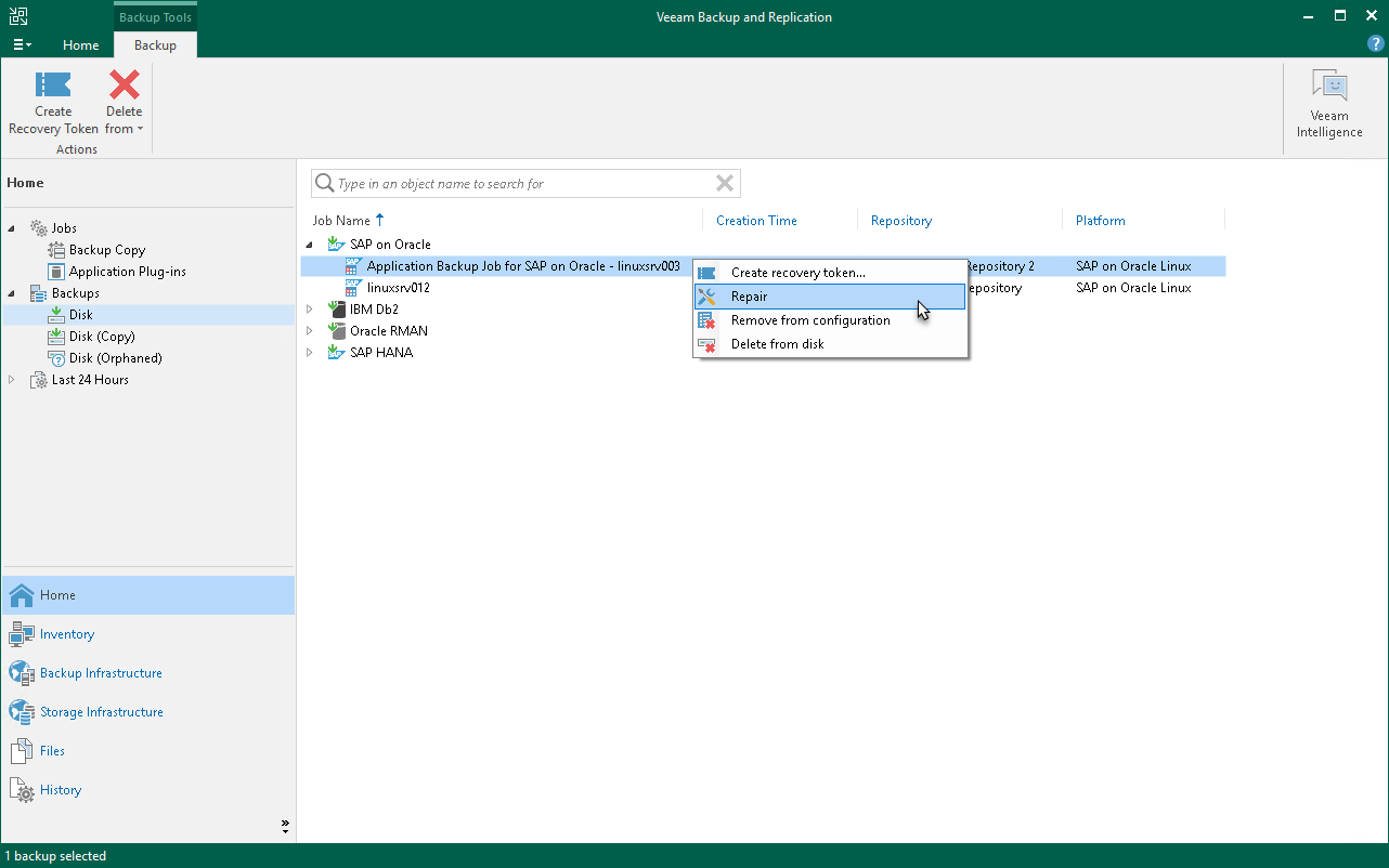 - [For the scale-out backup repository] If your backup job is targeted at the scale-out backup repository, Veeam Plug-in uses a backup server host name to create a folder where the backups will be stored. To repair your backup, you must create a new backup file in a new folder. The way you create a new folder depends on the scale-our backup repository configuration: