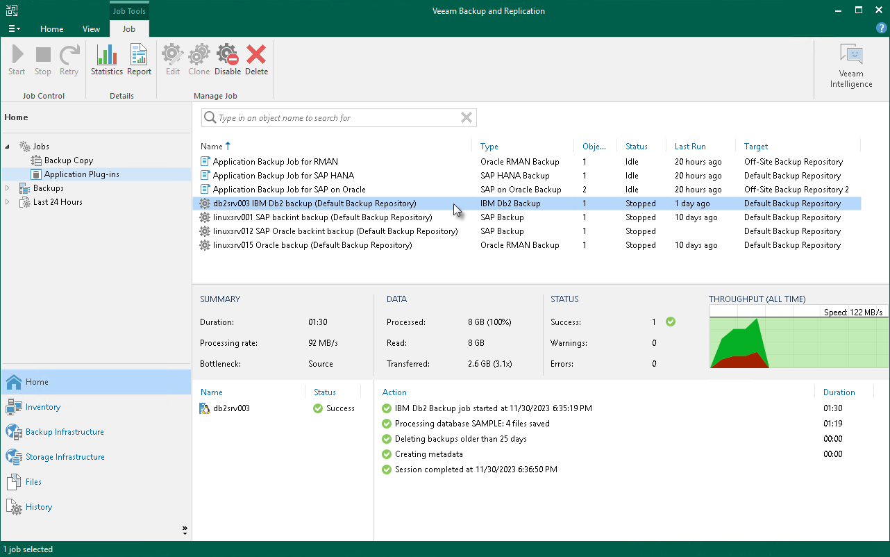 - In the working area, select the Veeam Plug-in backup job to see details of the current backup process or the last backup job session.