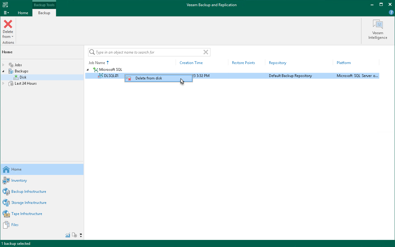 - In the working area, right-click the name of the backed-up object and select Delete from disk.